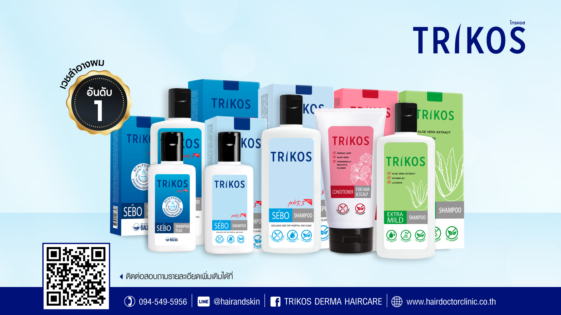ไทรคอส (TRIKOS) คือผลิตภัณฑ์เวชสำอางชั้นนำที่พัฒนาขึ้นเพื่อฟื้นฟูและบำรุงเส้นผมและหนังศีรษะอย่างครบวงจร ผลิตภัณฑ์นี้ได้รับการคิดค้นด้วยส่วนผสมที่ผ่านการวิจัยทางการแพทย์ เพื่อช่วยลดการขาดหลุดร่วงของเส้นผม บรรเทาปัญหาหนังศีรษะ และส่งเสริมสุขภาพเส้นผมที่แข็งแรงอย่างยั่งยืน ไทรคอสได้รับการยอมรับจากผู้เชี่ยวชาญด้านผิวหนังและใช้ในคลินิกและโรงพยาบาล